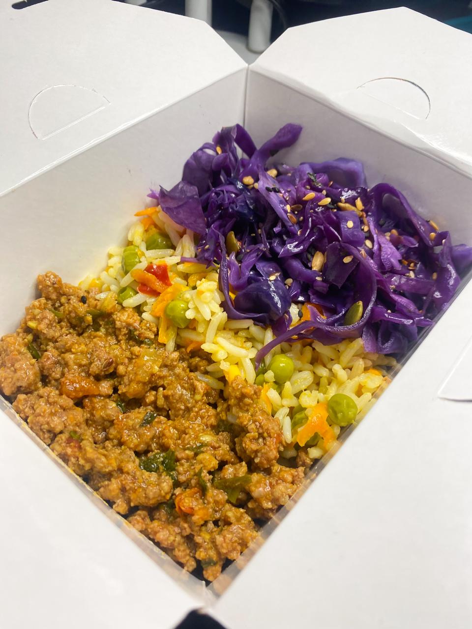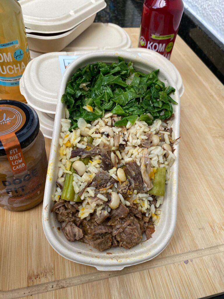 Comida típica do Nordeste: baião de dois com carne seca e quiabo, acompanhado de carne de panela e couve refogada. Sabor autêntico e acolhedor em cada garfada.