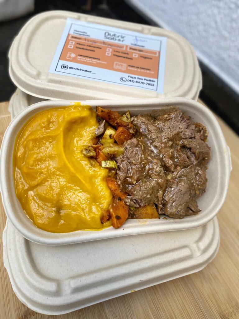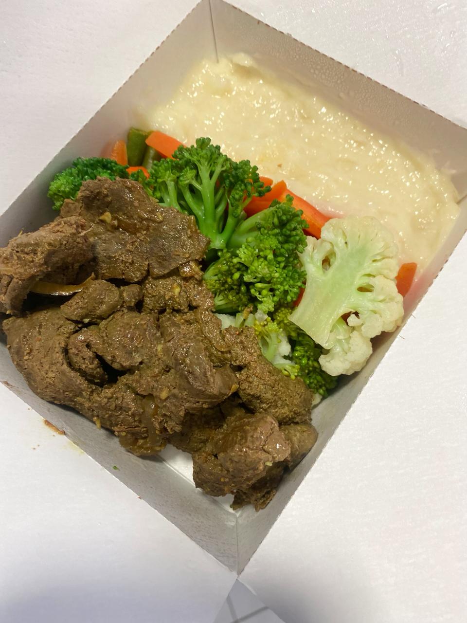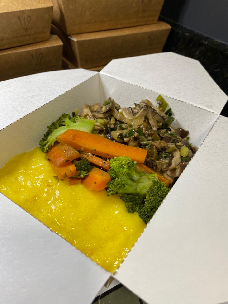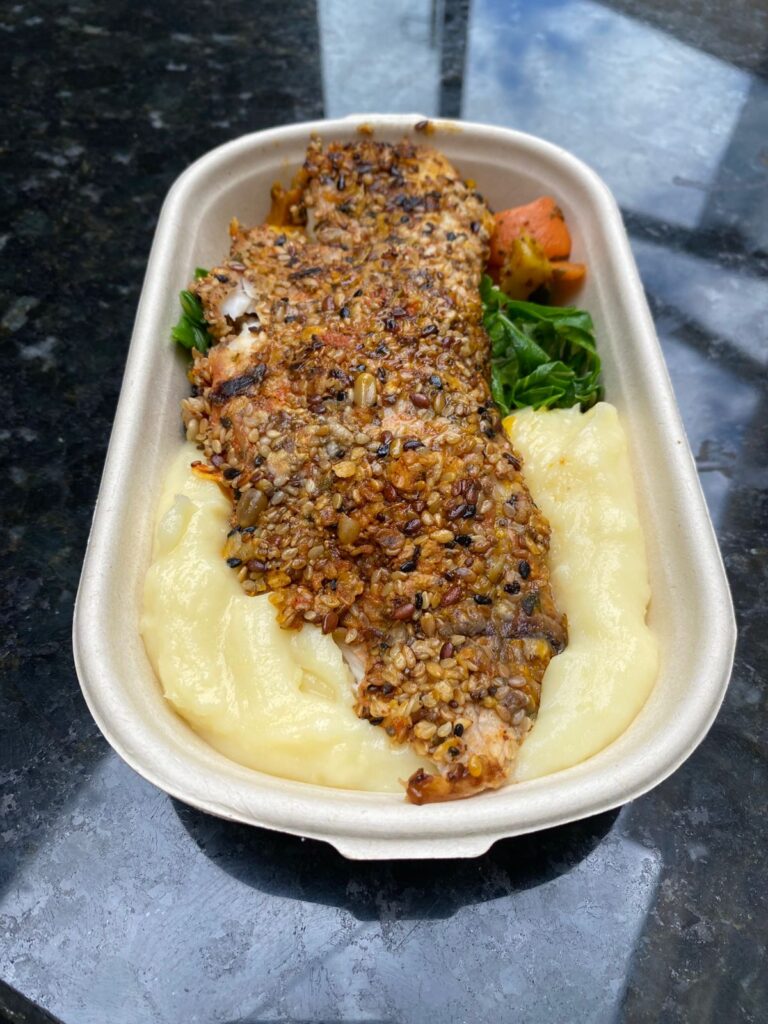 Tilápia empanada com gergelim, servida com purê de batata inglesa, couve refogada e mix de legumes. Leve, saborosa e equilibrada.